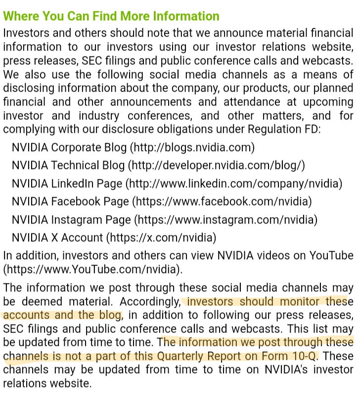 NVDA expects you to follow **ALL** 6 of its listed social media accounts and will be leaving out material information in its 10Q and 10k filings that will only be available in its listed social media accounts. This is clearly unethical, and our firm at this time questions whether this intent to distribute exclusive material information across 6 different channels is even legal. Though we do not have the legal training or background to make a claim one way or the other, we would like to assume that the system in place would not allow such a thing.