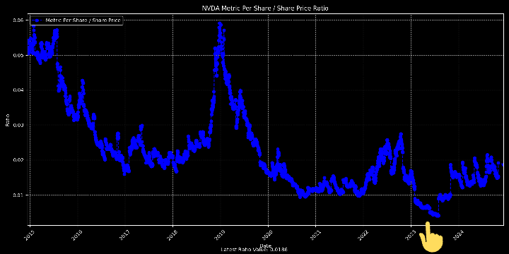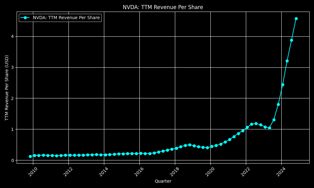 This graph shows what percentage of NVDA’s share price was being represented by the money it had made (ttm net income/shares/share price). This 10 year low during 2023, shows unequivically that there was in fact investment hype during this time, that the price per earnings went very high as people were willing to accept less than 1% earnings just to get in on the hype. Why would investors accept such low earnings per dollar? Because these investors anticipated that the rapid adoption of ChatGPT and the AI hype around it, would mean a growth for NVDA that would more than make up for the price they paid. So were they dumb? Did they overpay? Let’s find out!
